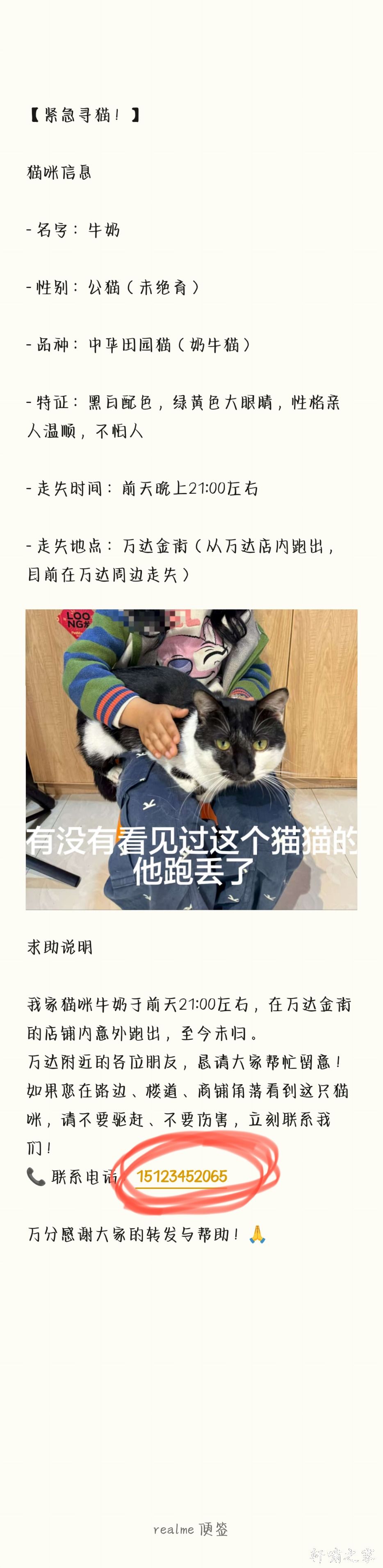 如果您在路边、楼道、商铺角落看到这只猫咪,请不要驱赶、不要伤害,立刻联系我们!