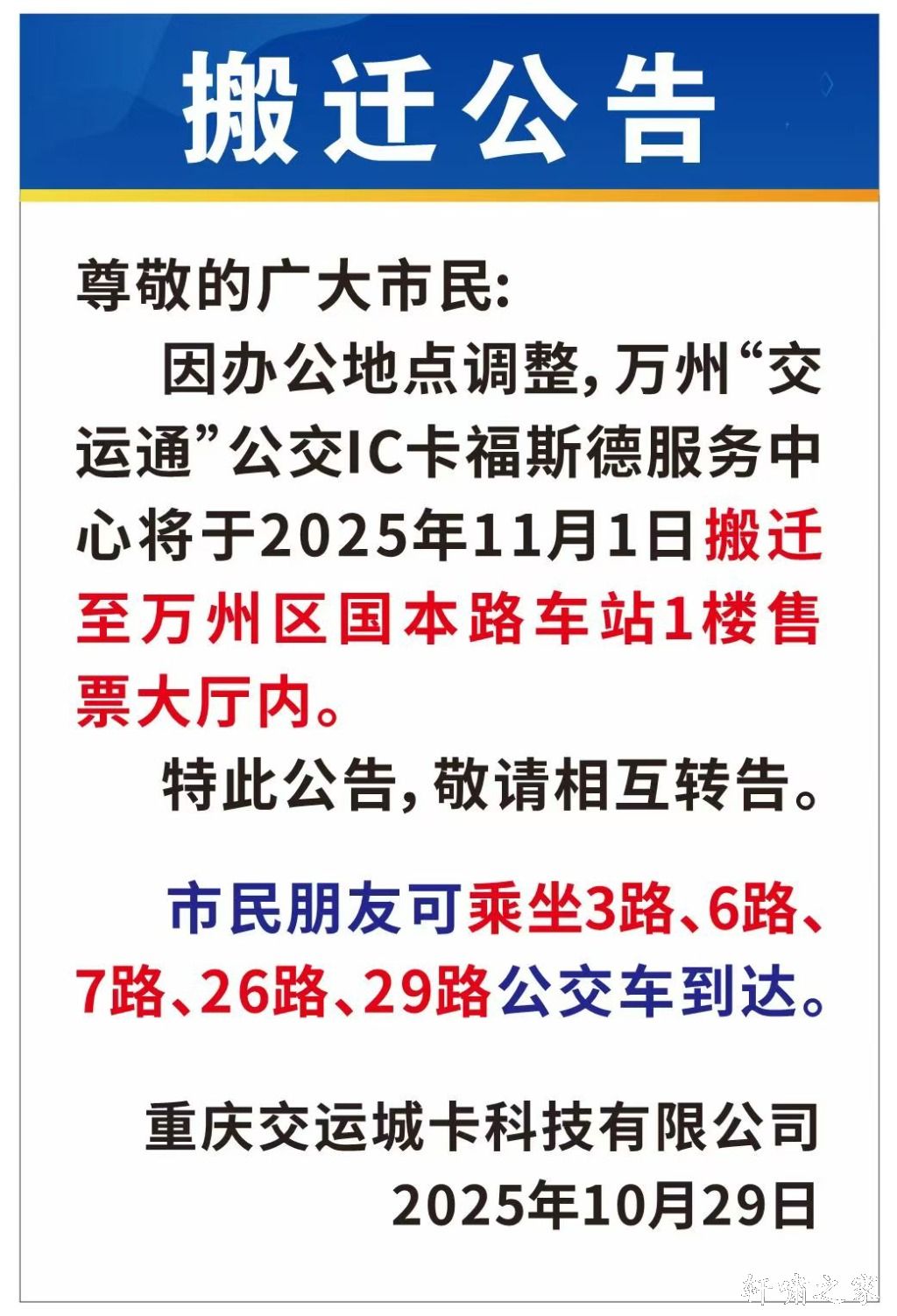 万州“交运通”公交IC卡福斯德服务中心搬迁公告