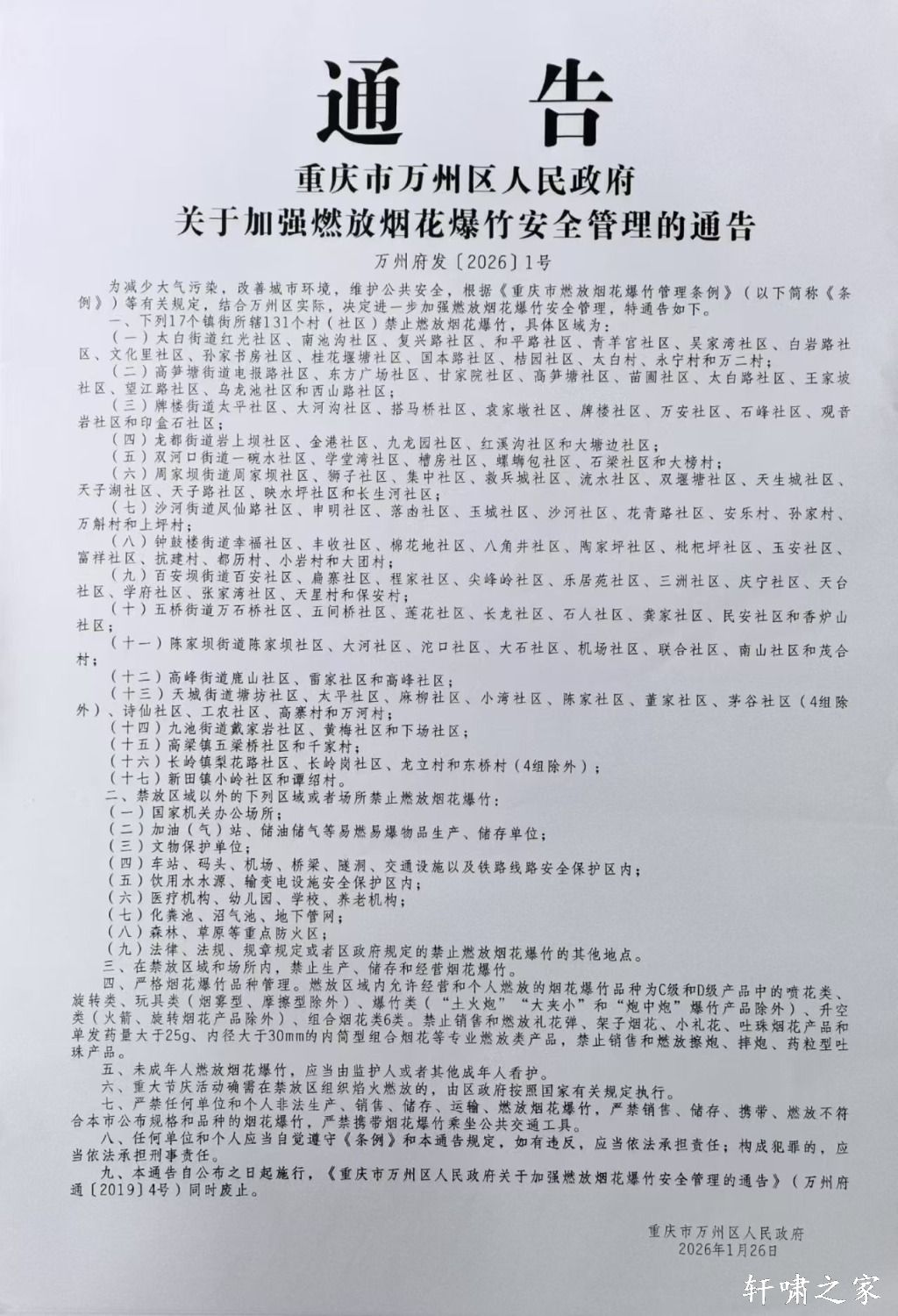 通告 重庆市万州区人民政府关于加强燃放烟花爆竹安全管理的通告