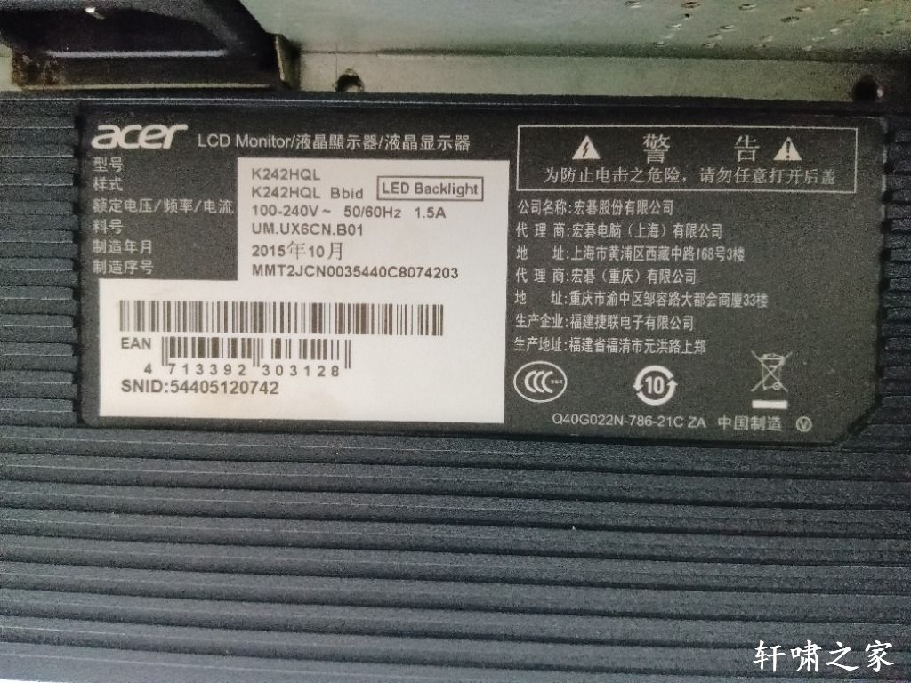 转让一个宏碁显示器,型号K242HQL,支持VGA、DVI、HDMI接口输入,24英寸60Hz,分辨率1920x1080,钢琴烤漆面板成色很好,显示正常按键功能正常,送一根VGA线,无电源线(电源线就是电饭锅那种线通用),80元万州沙龙路二段自提13594415941微信同步