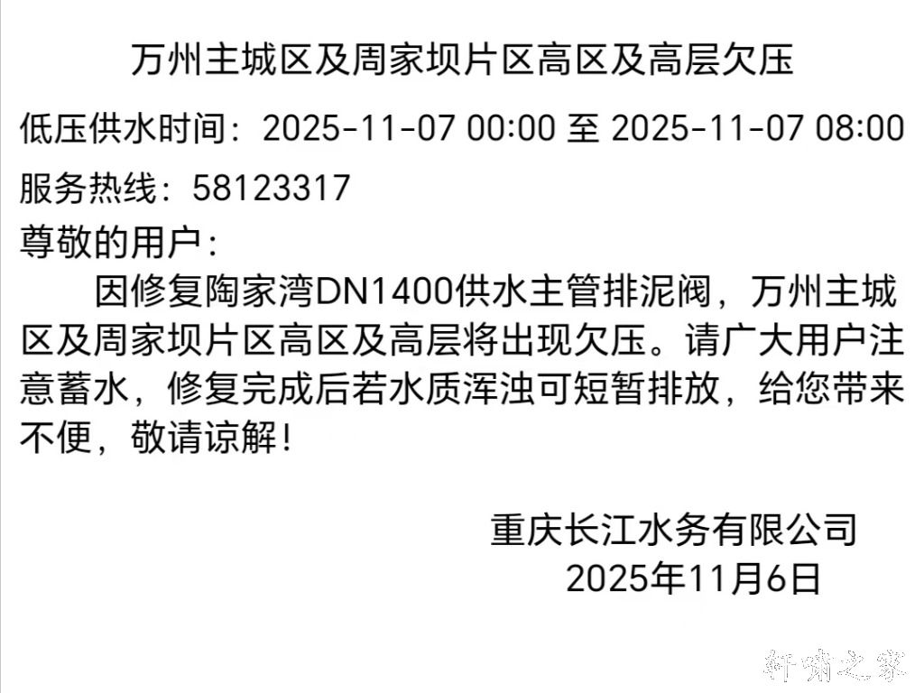 万州主城区及周家坝片区高区及高层欠压供水提醒