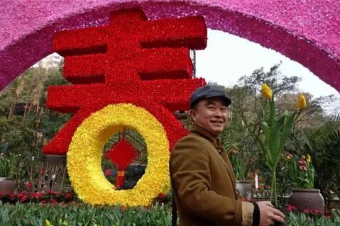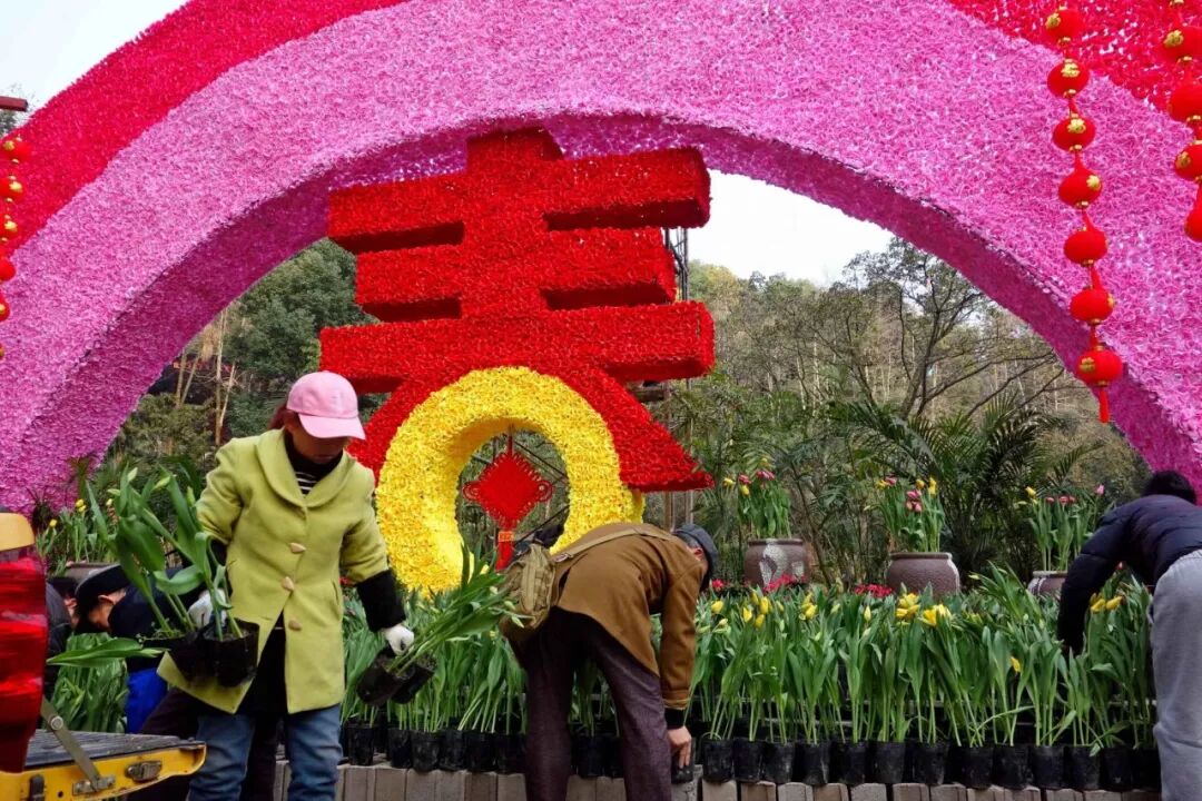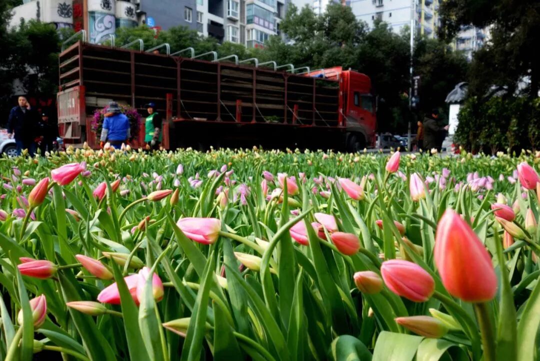 北滨路的造型鲜花架上也已经摆放上了郁金香,