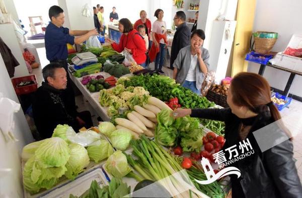 4月2日,万州区五桥街道长龙社区农贸市场投入使用,菜商邓永健和他幺爸正在出售新鲜蔬菜