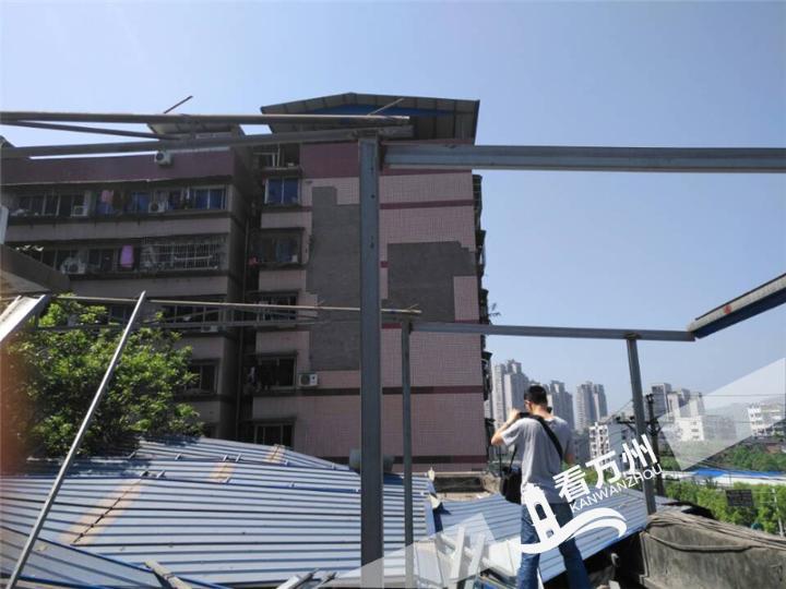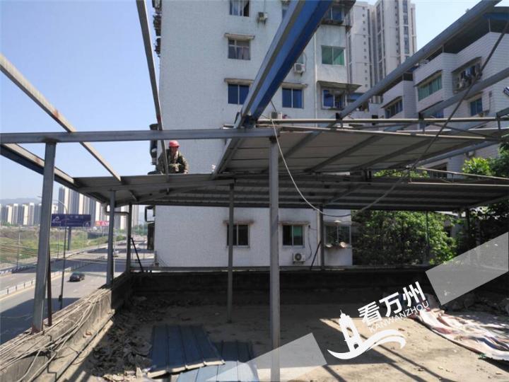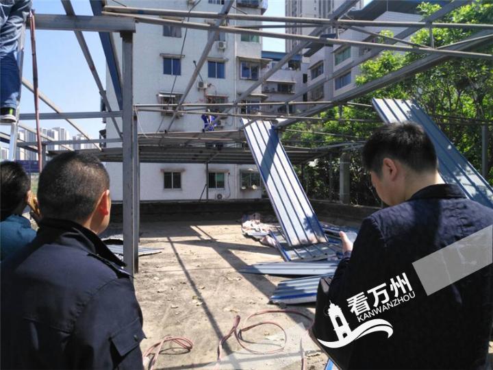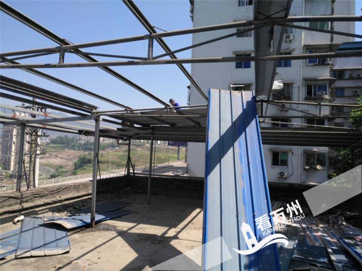钻声隆隆,焊花飞溅。4月17日上午,周家坝街道天子路一家楼房顶楼的彩钢棚被不断从棚架上剥落,楼顶上都处都是被拆除的彩钢板。这家楼房顶楼的违法建筑被拆除,标志着周家坝街道主干道违法建筑整治已正式全面启动。