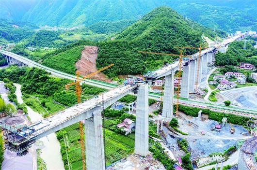 7月18日,郑万高铁保康段后坪镇天池特大桥加紧施工。郑万高铁保康段总里程63.2公里,桥梁11座,隧道12座,桥隧比达99.6%。截至目前,桥梁完成桩基1178根,完成总工程量的93%。郑万高铁是郑渝高铁的重要组成部分,预计2022年全线建成通车。(视界网 杨韬 摄)