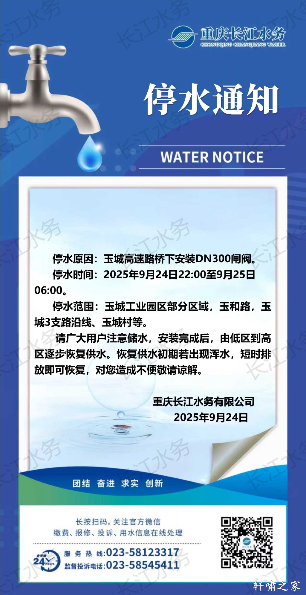 停水时间:2025-09-24 22:00至2025-09-25 06:00停水类型:玉城高速路桥下安装DN300闸阀