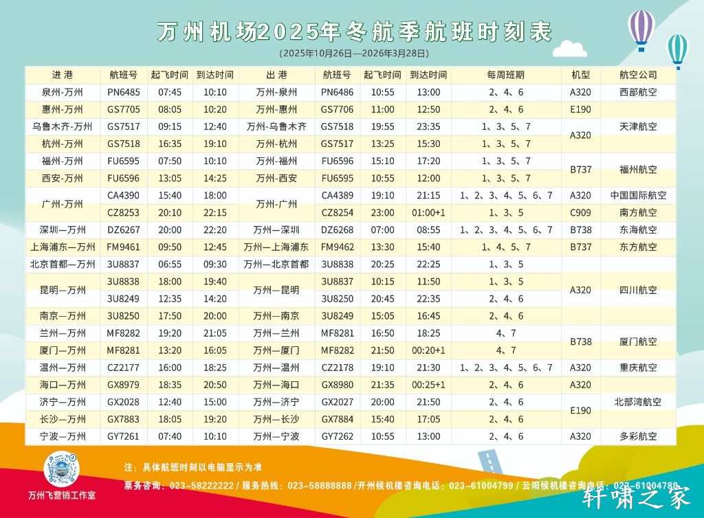 万州机场2025年冬航季航班时刻表