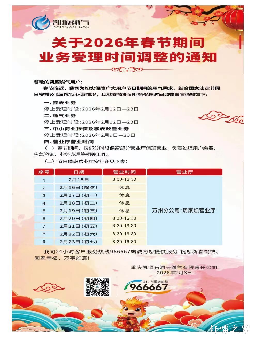 凯源燃气关于2026年春节期间业务受理时间调整的通知