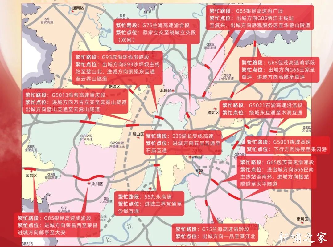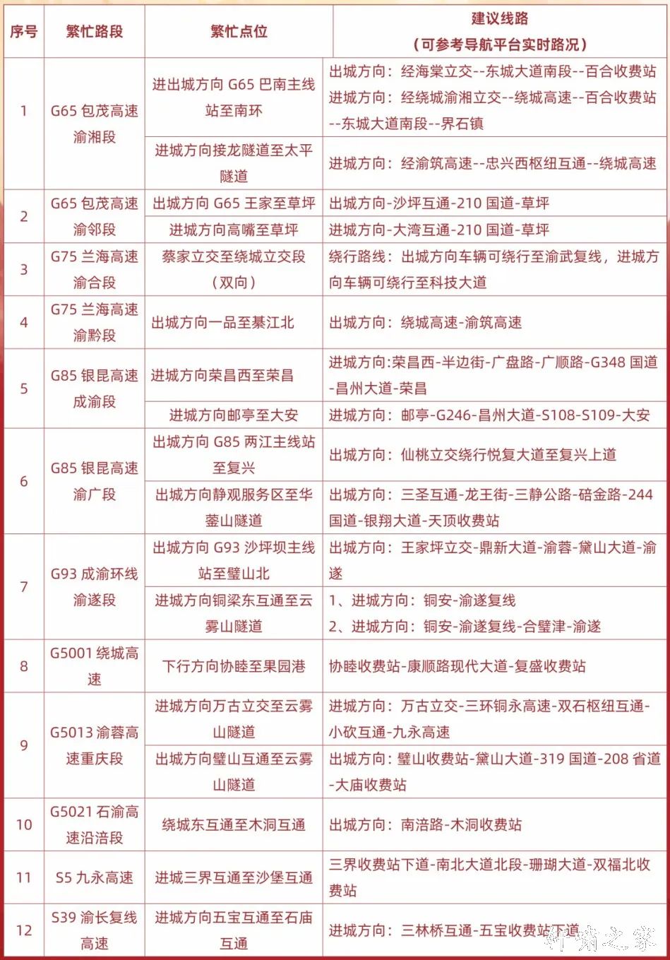 重庆高速特意梳理了节日期间可能出现繁忙的路段,公众在出行游玩前可作参考,避免拥堵。