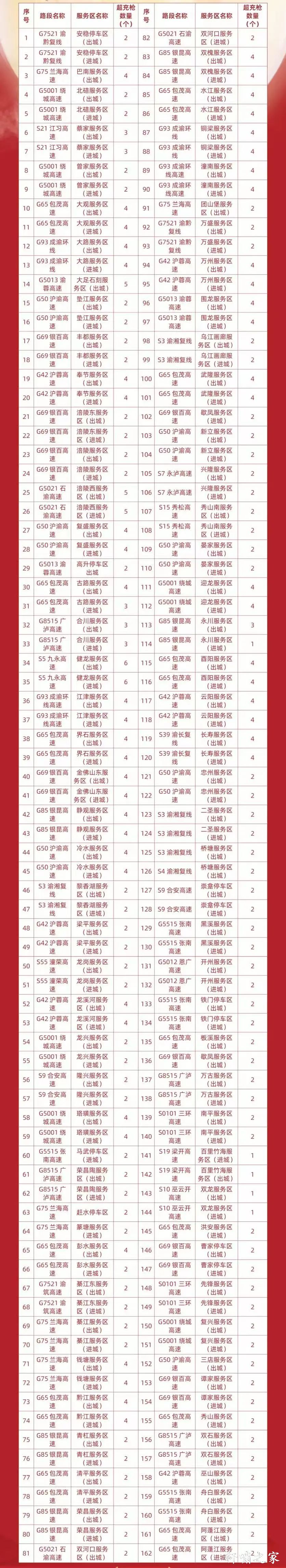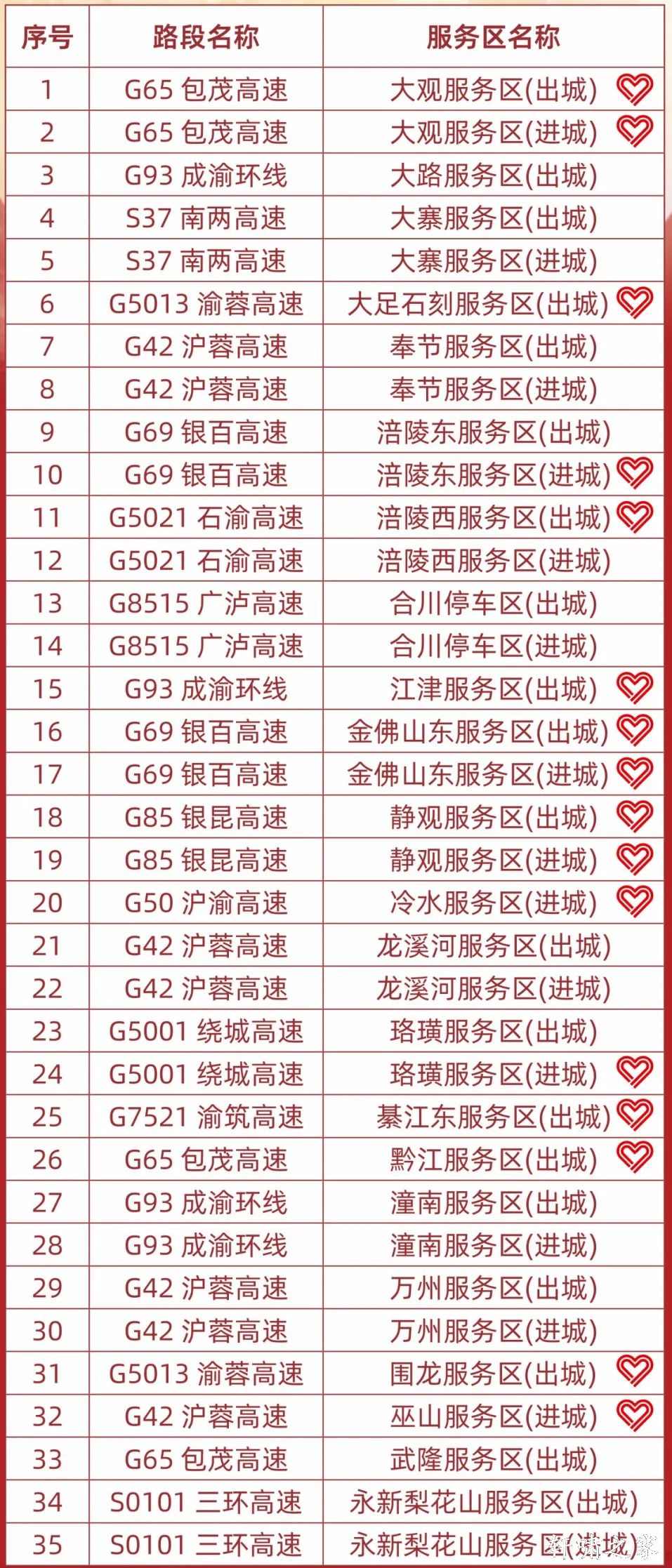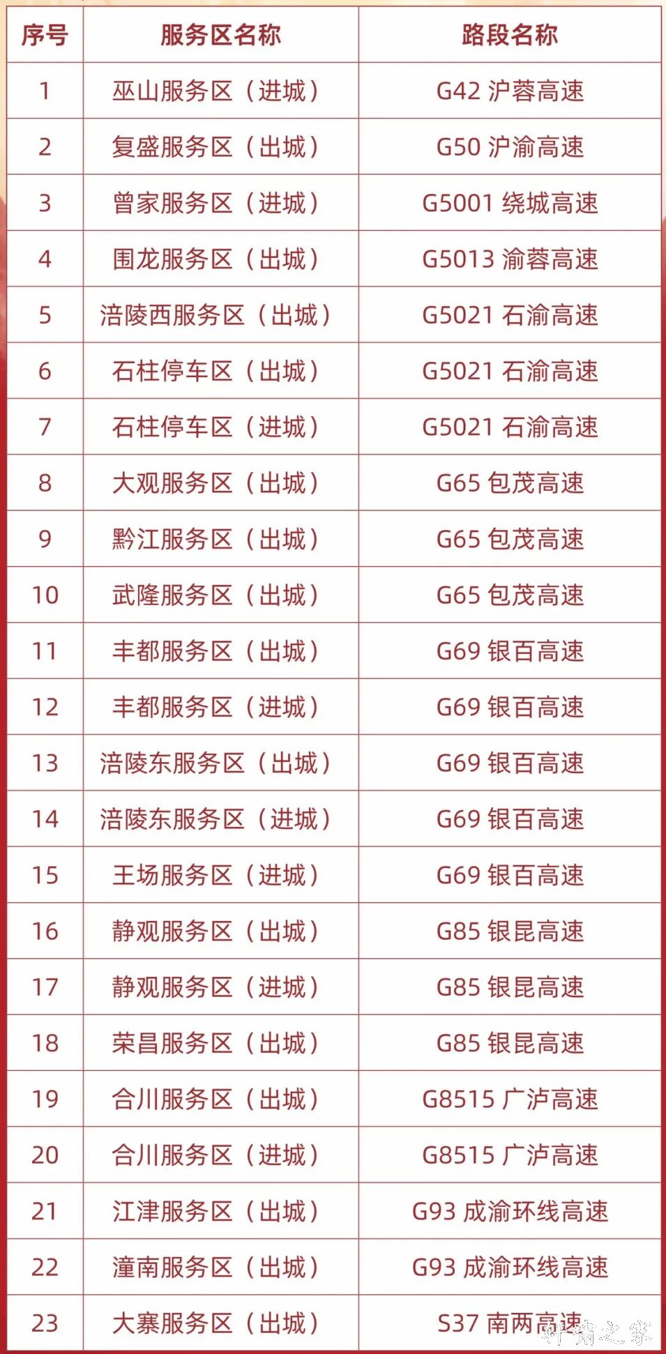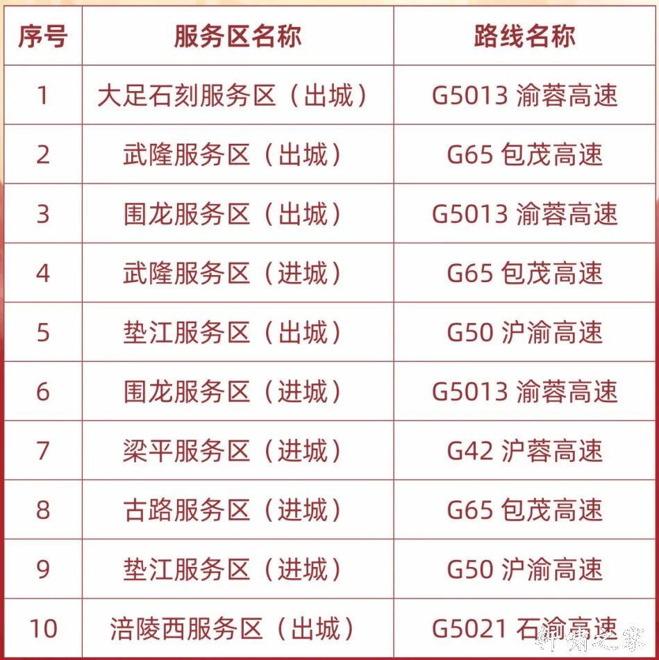 重庆高速特梳理了较繁忙的服务区点位,请提前做好行程规划。